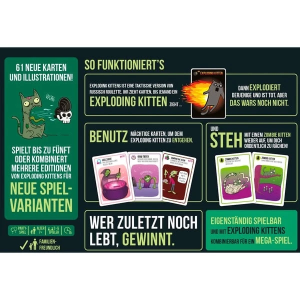Wer Exploding Kittens schon lange spielt und glaubt, dass er alle Regeln kennt, der irrt. Denn in diesem Spiel aus dem Exploding-Kittens-Universum können die Katzen zwar explodieren, aber auch als Zombies wieder auferstehen. Wer schafft es schließlich, am Leben zu bleiben und dem Totenreich zu entfliehen?Art.-Nr.: 1902453