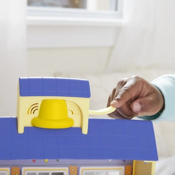 Mit dem Spielset Peppas Spielgruppe können sich Kinder ab 3 Jahren einen spannenden Tag mit Peppa Wutz ausdenken. Die Spielgruppe ist von der Serie inspiriert und kann bei Vorschulkindern die Vorfreude wecken, bald selbst zur Schule zu gehen! Wird der Hebel heruntergedrückt, beginnt die Glocke der Spielgruppe zu klingeln und kündigt so den Beginn der Lernzeit an. Außerdem können die Zeiger der Uhr und das Rädchen an der Tafel gedreht werden, sodass sich das Lernthema auf der Tafel verändert, während Madame Gazelle spricht. Wird eine Figur auf dem Aktivierungspunkt vor der Tafel platziert, erklingen verschiedene Sätze (nur in Englisch). Die Bühne hat eine doppelseitige Kulisse. Wird eine der 7,5 cm großen Figuren auf der Bühne platziert kann sie durch Drehen des Rädchens bewegt werden! Dank der 3 Figuren und 9 Accessoires begeistert dieses oinktastische Geschenk kleine Fans von Peppa Wutz und weckt ihre Vorfreude auf die Schule!Art.-Nr.: 1825101