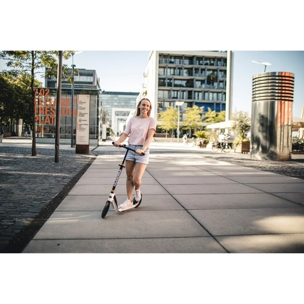 Der HUDORA BigWheel Style 230 besitzt eine coole Optik und eine exklusive Sonderausstattung. Mit ihm sind hohe Geschwindigkeiten bei großem Fahrkomfort und maximaler Sicherheit möglich. Er überzeugt dank Anti-Schock-Komfortgriffen, Warnglocke und verstärktem Aluminium-Deck. Auf der supergroßen Trittfläche haben erwachsene Fahrer bequem Platz. Ein weiteres Highlight ist die extra für den Style 230 entwickelte, extrudierte Hinterrad-Reibungsbremse. Durch ihr funktionales Design läuft sie nicht so schnell heiß und verschleißt weniger. Der integrierte Schmutzfänger hält die Hosenbeine sauber. Der Scooter ist praktisch für die Fahrt ins Büro, zum Sport oder für kleine Besorgungen. Am Ziel angekommen, lässt sich der Style 230 leicht zusammenfalten und mit dem verstellbaren Umhängegurt tragen. Die großen Voll-PU-Rollen haben vorne einen Durchmesser von 230 mm und hinten 205 mm. Mit einem maximalen Nutzergewicht von 120 kg ist der Style 230 extrem belastbar.Art.-Nr.: 1194178