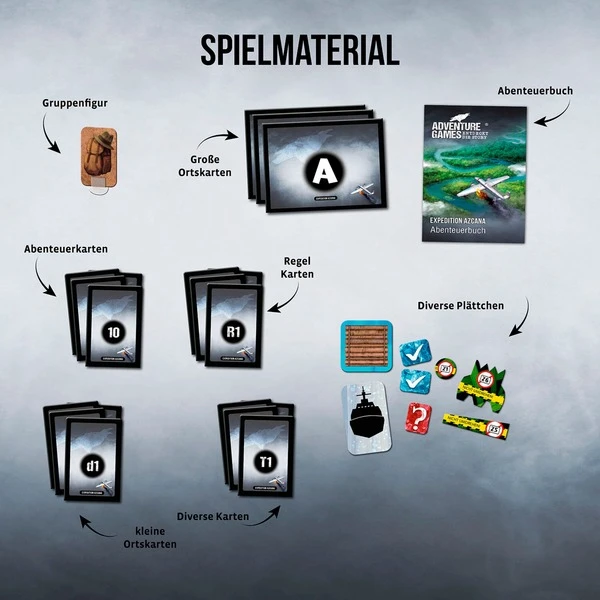 | Inhalt/Ausstattung | Abenteuerbuch, 1Forschungsheft, 17 Ortstafeln, 112 Karten, Anleitung, Spielfigur mit Standfüßchen, 31 Plättchen, 2 Zip-Beutel | ||