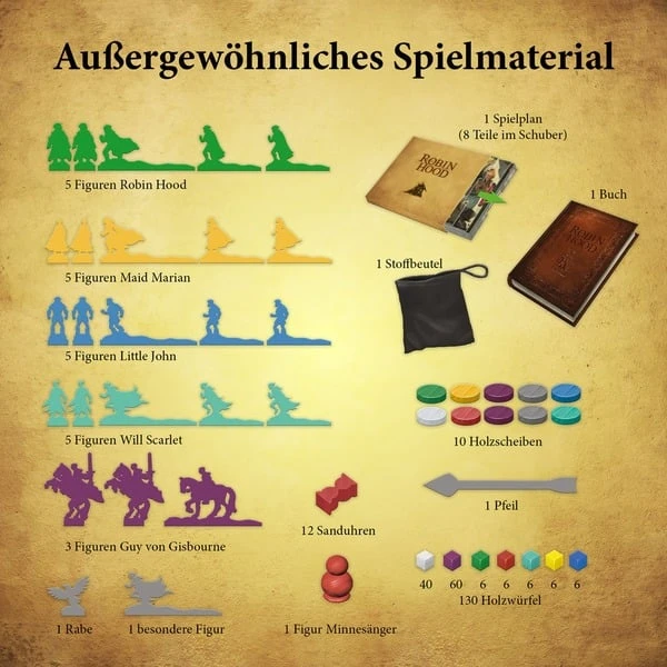 England 1193. Die Grafschaft Nottingham leidet unter dem Joch des bösen Prinz John und seiner Handlanger. Ihr schlüpft in die Rollen von Robin Hood und seiner Gefährten Little John, Maid Marian und Will Scarlet. Gemeinsam stellt ihr euch in diesem Spiel dem Unrecht entgegen und kommt dabei einem dunklen Geheimnis auf die Spur. Auf dem großen Spielplan könnt ihr eure Figuren völlig frei bewegen, mit Dorfbewohnern sprechen und Gegenstände erkunden. Stets müsst ihr euch dabei vor den Schergen des Sheriffs von Nottingham in Sicherheit bringen. Aufbauen und losspielen ihr startet sofort ins erste Abenteuer. Das im Brettspiel enthaltene Buch begleitet euch durch die spannende Geschichte. Ein tolles Geschenk nicht nur für Robin-Hood-Fans!Art.-Nr.: 1733385