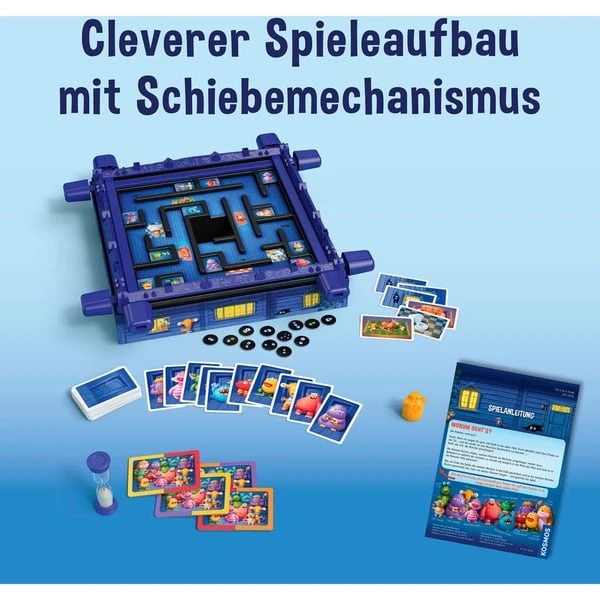 | Inhalt/Ausstattung | 1 Spielaufbau-Villa mit Spielplan in der Schachtel, 4 Schieber, 12 Monster-Chips, 1 Figur „Monster im Sack“, 72 Monster-Karten, 6 Orts-Karten, 4 Ablagetafeln, 12 Augen-Chips, 1 Sanduhr, 1 Spielanleitung | ||