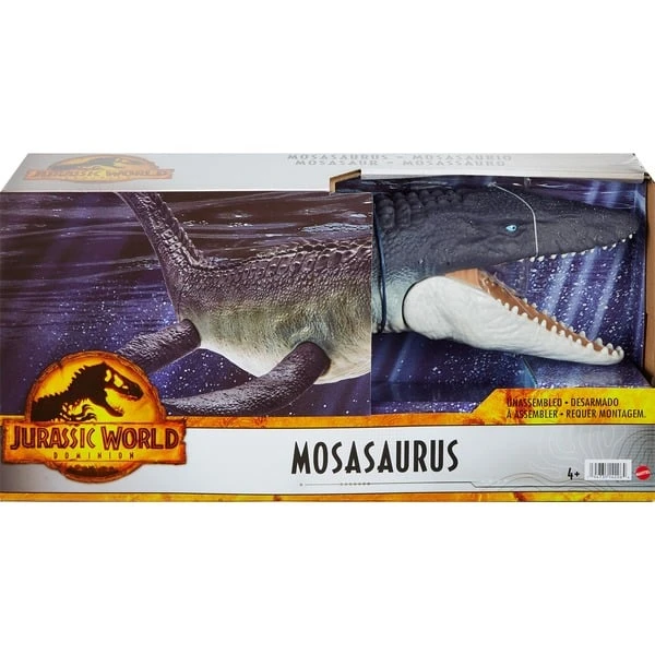Mit diesem Riesendino aus dem Meer können Kinder spannende Action und Abenteuer wie im Film „Jurassic World: Ein neues Zeitalter“ erleben. Die realistische Form und die beweglichen Gelenke dieser vom Film inspirierten Actionfigur sorgen für noch mehr Spielspaß. Diese riesige Figur ist ca. 21,6 cm hoch und beinahe 76 cm lang und mit ihrem beweglichen Kiefer der Schrecken jedes Dinosaurierspiels. Und mithilfe von Augmented Reality (AR) kann der Mosasaurus sogar in die digitale Spielwelt erweitert werden und dort zum Leben erwachen! So real kann das Spielen mit Dinos sein – wer wagt es? Einfach mit einem beliebigen Mobilgerät (nicht im Lieferumfang enthalten) den versteckten DNA-Code scannen, um die AR-Funktionen in der kostenlosen Jurassic World Facts App freizuschalten (Android und iOS). Art.-Nr.: 1888802