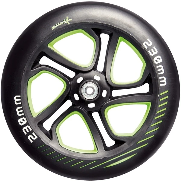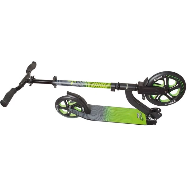| Inhalt/Ausstattung | Klappbarer Scooter aus Aluminium, verstärkte Vorderradgabel, BMX-Style Lenker mit TPR Griffen, Anti-Slip Bremspedal, tiefergelegtes Deck, Kugellager ABEC 7, PU Rollen 230 mm Vorder- und 205mm Hinterrad, 82 A, Ständer, Klappmechanismus | ||