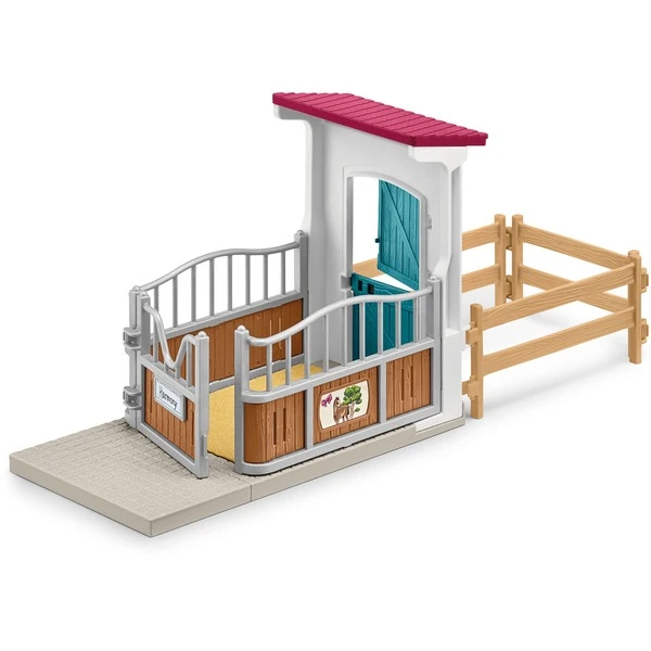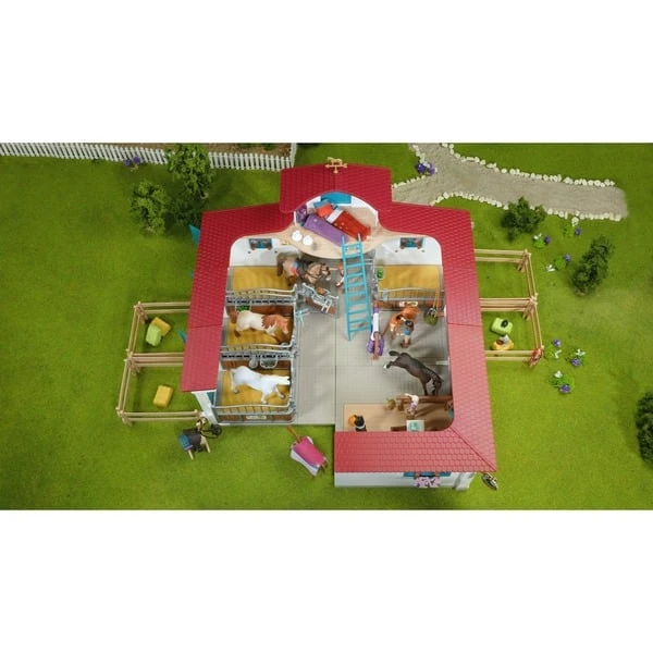| Inhalt/Ausstattung | 1 Haus, 3 Pferdeboxen, 1 Putzplatz, 1 Holzpferd, 2 Tassen, 2 Teller, 1 Hafersack, 2 Reitkappen, 2 Strohballen, 2 Heuballen, Silage, Eimer, 2 Striegel, 2 Äpfel, 2 Möhren, Katze, Maus, 3 Pferde, Heugabel, Besen, 2 Satteldecken, 2 Schlagsäcke, 2 Kissen, Cowboy Hut, 2 vollbewegliche Figuren | ||