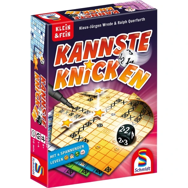 KANNSTE KNICKEN kannste aber erst, wenn alle Smileys in einer Ecke angekreuzt sind. Dabei müssen sich die Spieler jedes Mal neu entscheiden, ob sie nur die kleine Ecke umknicken oder die große Ecke, die mit einem dauerhaften Bonus verbunden ist. Wie gewohnt spielen in diesem neuen „Klein&Fein“ alle gleichzeitig und wählen aus zwei Spezialwürfeln die Schrittzahl für ihre Kreuze aus. Wer hierbei zuerst alle seine 4 Ecken umgeknickt und die darauf erschienenen Zielsymbole miteinander verbunden hat, gewinnt. Vier verschiedene Level mit unterschiedlichen Schwierigkeitsgraden sorgen für abwechslungsreichen Spielspaß.Art.-Nr.: 1712066