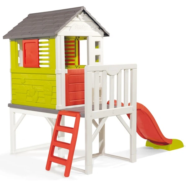 Mit dem neuen Stelzenhaus von Smoby können Kinder ihr erstes ganz eigenes Häuschen beziehen! Das Traumhaus für den Garten steht auf stabilen Pfählen und verfügt über eine Veranda, eine Kletterleiter und eine tolle Rutschbahn von 1,5 m Länge, mit der die Kleinen im Nu nach unten rutschen können. Dank des besonderen Fertigungsverfahrens ist dieses einzigartige Gartenhäuschen aus hochwertigem Kunststoff besonders stabil, im Vergleich zu Holzhäusern aber trotzdem leicht und einfach und schnell zu montieren. Die vier Seitenwände des Hauses sind detailreich gestaltet, Schmetterlinge und eine kleine Katze zieren die Fassade und geben ihm so ein lustiges Äußeres. Zwei Schiebefenster mit Lamellen zum Auf- und Zuschieben, ein kugelrundes Bullaugen-Fenster sowie eine kleine Eingangstüre ergänzen die kindgerechte Ausstattung dieses vielseitigen Spielhauses, das eine wirkliche Bereicherung im Garten von Mama und Papa ist. Das Stelzenhaus von Smoby ist aus UV-stabilem Kunststoff hergestellt und deshalb besonders widerstandsfähig gegen Wettereinflüsse und Ausbleichung.
